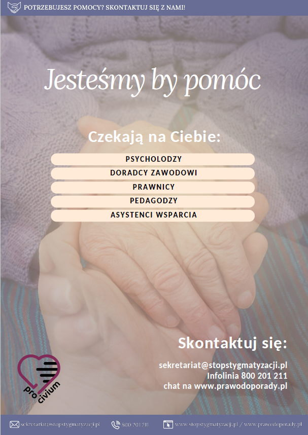Co proponujemy?Wsparcie dla osoby osadzonej w zakładzie karnymkliknij na okładkę i zapoznaj się z całym poradnikiem Wsparcie indywidualnekliknij na okładkę i zapoznaj się z całym poradnikiem A zatem decyduj! Świadomie! Jeśli będzie potrzebne Ci wsparcie, na którymkolwiek z etapów to są 3 możliwości:MOŻLIWOŚĆ 1 Skontaktuj się z nami telefonicznie:800 201 211 MOŻLIWOŚĆ 2Skontaktuj się z nami mailowo:sekretariat@stopstygmatyzacji.pl MOŻLIWOŚĆ 3Skontaktuj się z nami listownie:ul. Przełom 1, 61-423 Poznań