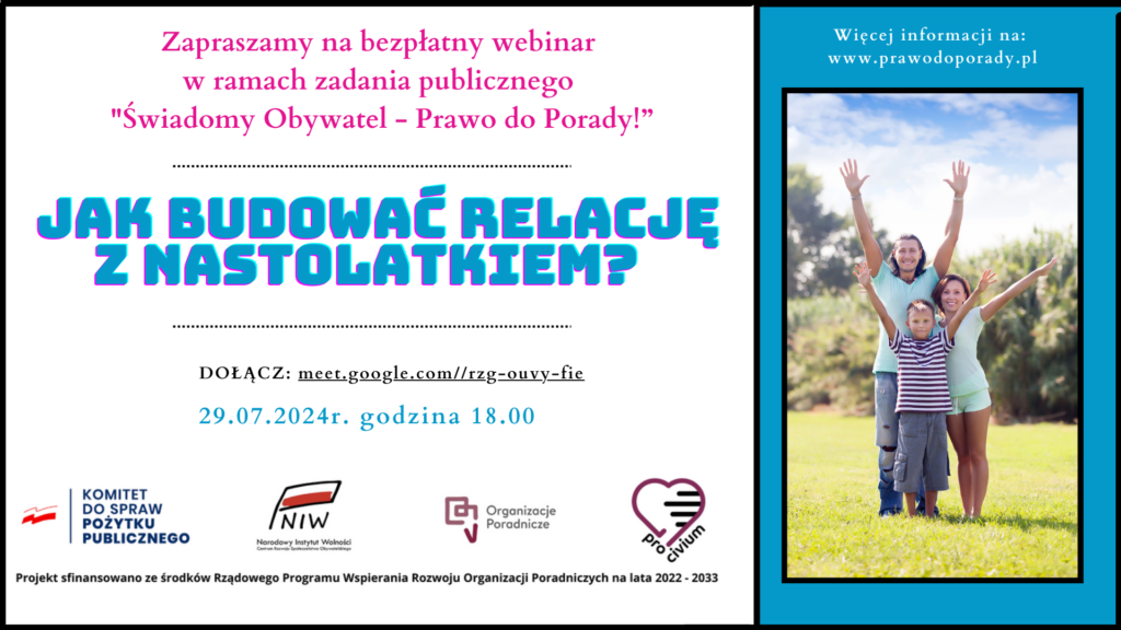 Zapraszamy na darmowy webinar „Jak budować relacje z nastolatkiem”, który odbędzie się 29 lipca o godzinie 18:00. To wyjątkowe wydarzenie, które pomoże ci zrozumieć i zbliżyć się do swojego dziecka w trudnym okresie dorastania.