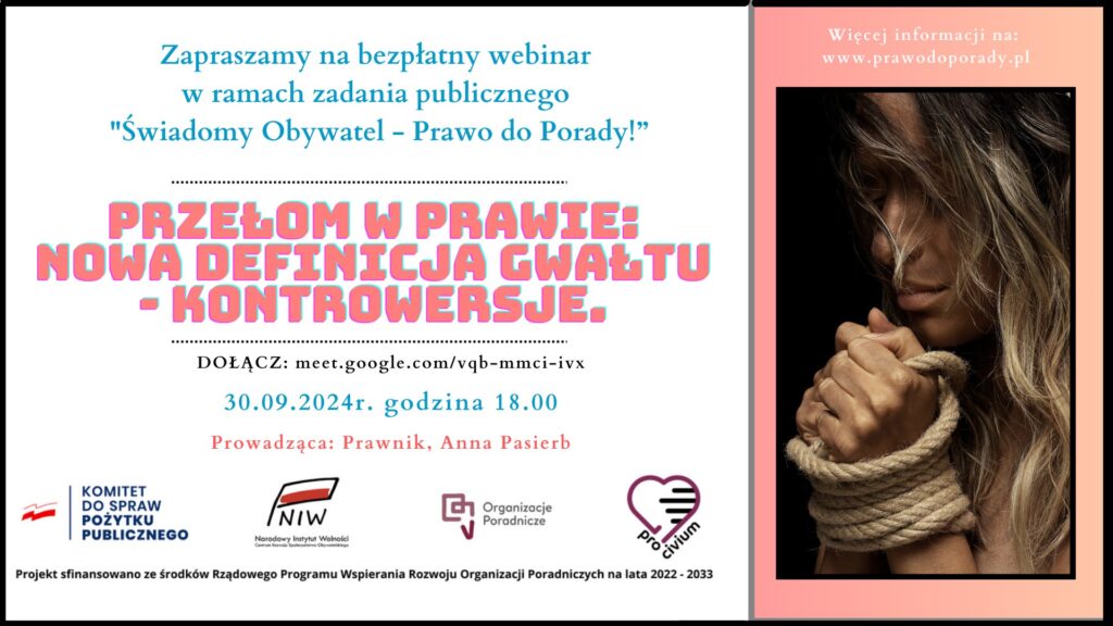 Już 30 września 2024 roku o godzinie 18:00 odbędzie się wyjątkowy webinar, który poprowadzi prawnik Anna Pasierb. Spotkanie skierowane jest do wszystkich, którzy chcą zgłębić tematykę nowej definicji gwałtu w polskim prawie, wprowadzonej przez ostatnie zmiany legislacyjne. To doskonała okazja, aby zrozumieć konsekwencje tych regulacji zarówno dla ofiar, jak i dla całego systemu prawnego.