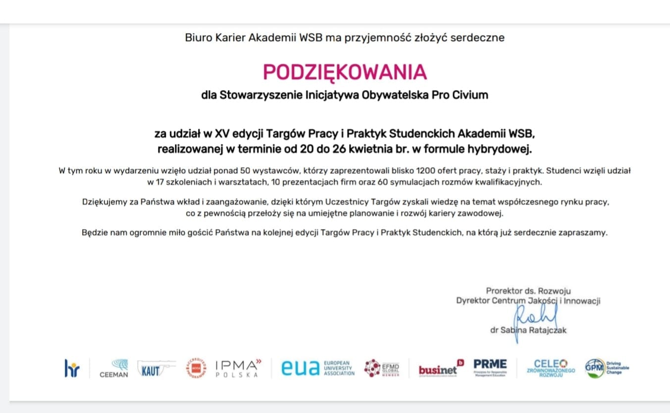 Prorektor ds. Rozwoju Akademi WSB w Dąbrowie Górniczej podziękował Stowarzyszeniu za wsparcie studentów w nabyciu kompetencji wyboru właściwej ścieżki rozwoju zawodowego.