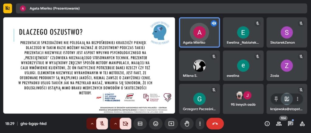 Prowadząca Agata Mieńko, psycholog, członek Sekcji Wsparcia Rozwoju Osobistego w Stowarzyszeniu, omówiła wiele form oszustw, odpowiadała na pytania uczestników i bardzo szczegółowo odniosła się do kwestii wstydu osób oszukanych, szczególnie seniorów, co wpływa na brak ujawniania takich przestępstw oraz brak możliwości reakcji ze strony rodziny, np. w sytuacji, gdy senior przepłacił za zakup zbędnego produktu. W webinarze wzięły udział 104 osoby. Dziękujemy za promocję webinaru współpracującym urzędom